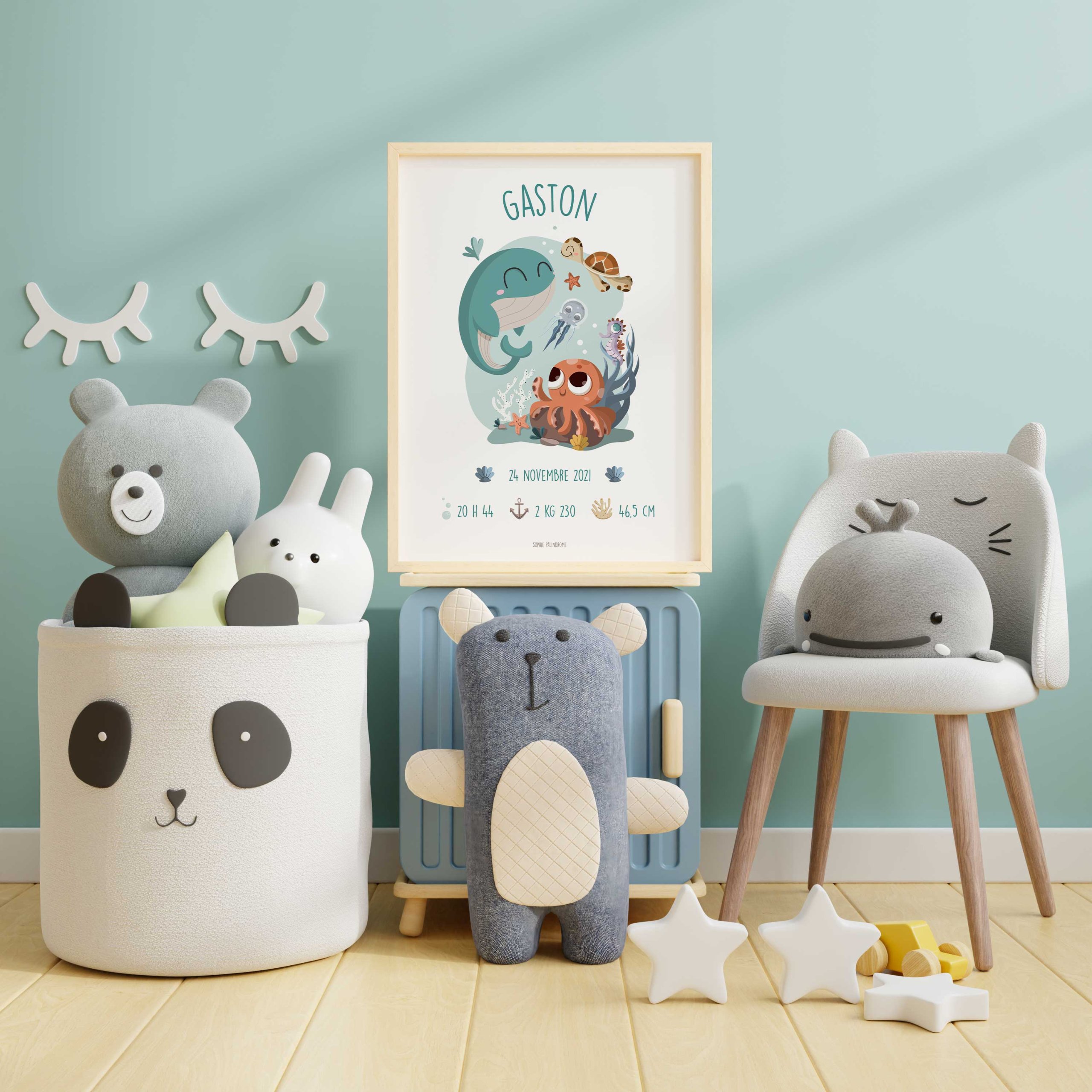 Découvrez cette magnifique affiche animaux personnalisable sur le thème captivant des animaux de la mer. Ce tableau de naissance unique en son genre est conçu pour immortaliser les précieux souvenirs de l’arrivée de votre tout-petit dans ce monde merveilleux.