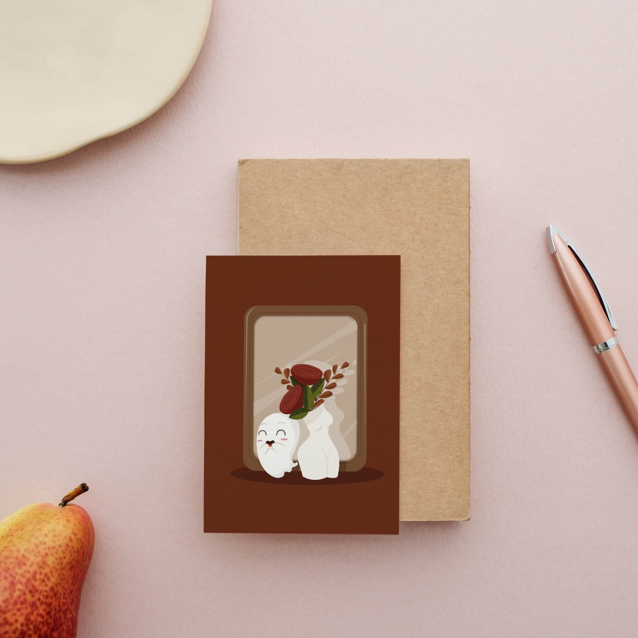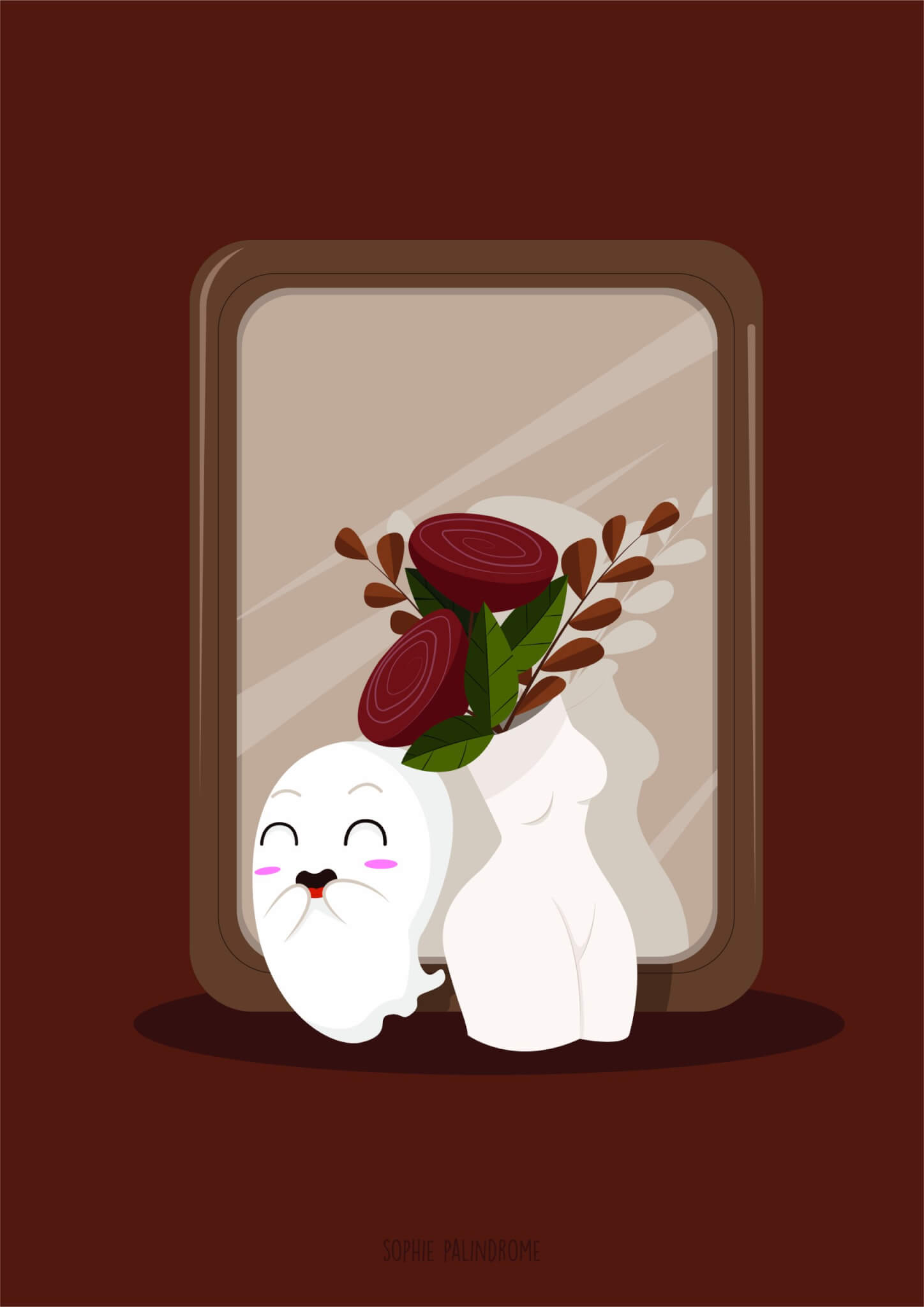 Un petit fantôme timide devant ce petit vase en forme de buste de femme. Illustration toute mignonne pour venir décorer un bureau ou un mur de votre salon. Ami des fantômes, cette affiche est faite pour vous. De plus, elle est disponible en trois formats, si vous voulez l’encadrer pour la déposer sur votre bureau.