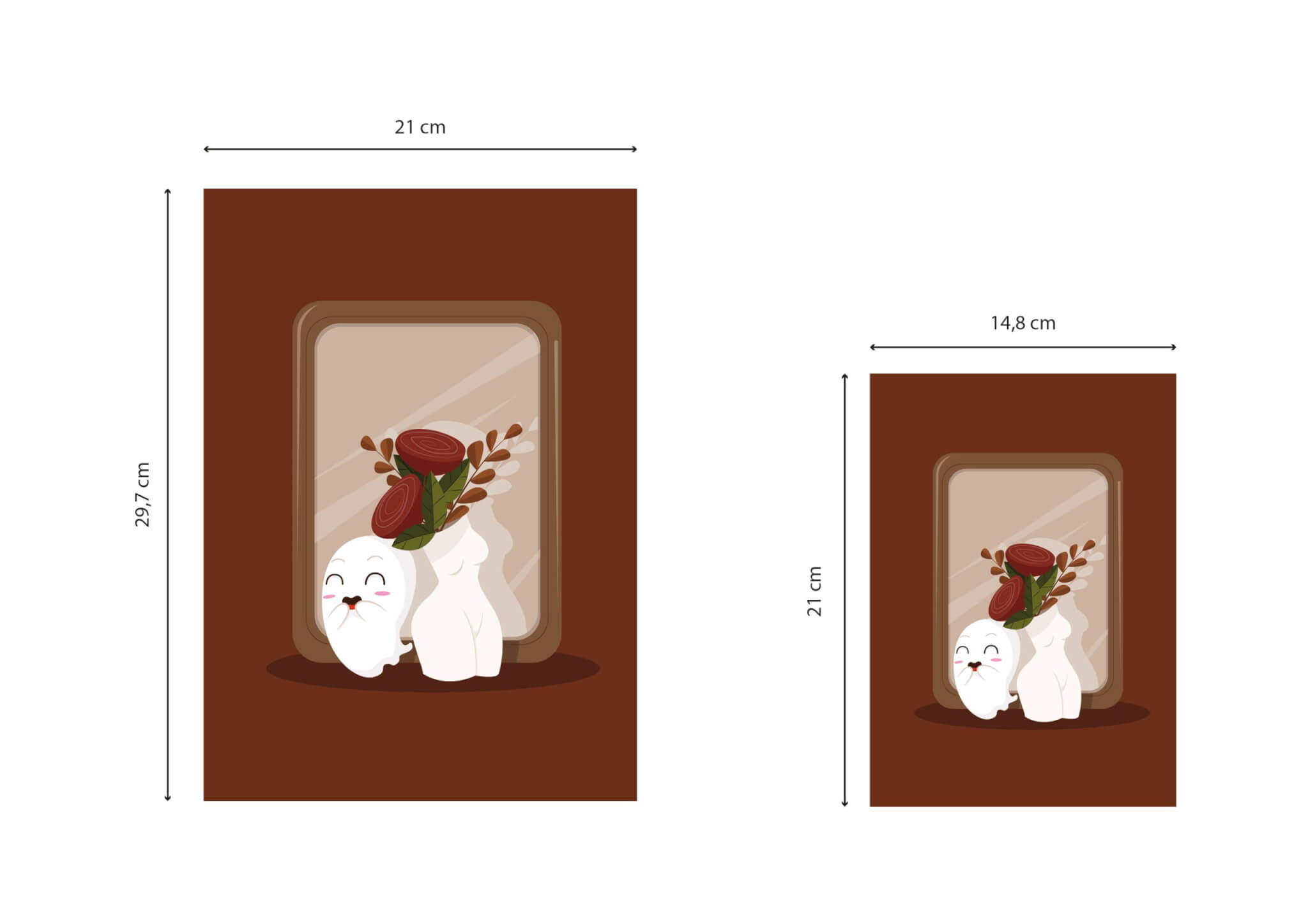 – L’illustration est disponible au format A5 (14,8 x 21 cm) et A4 (21 x 29,7 cm) imprimée sur du papier ultra blanc 350g/m2, ainsi qu’au format A3 (29,7 x 42 cm) imprimée sur du papier extra blanc 250g/m2.