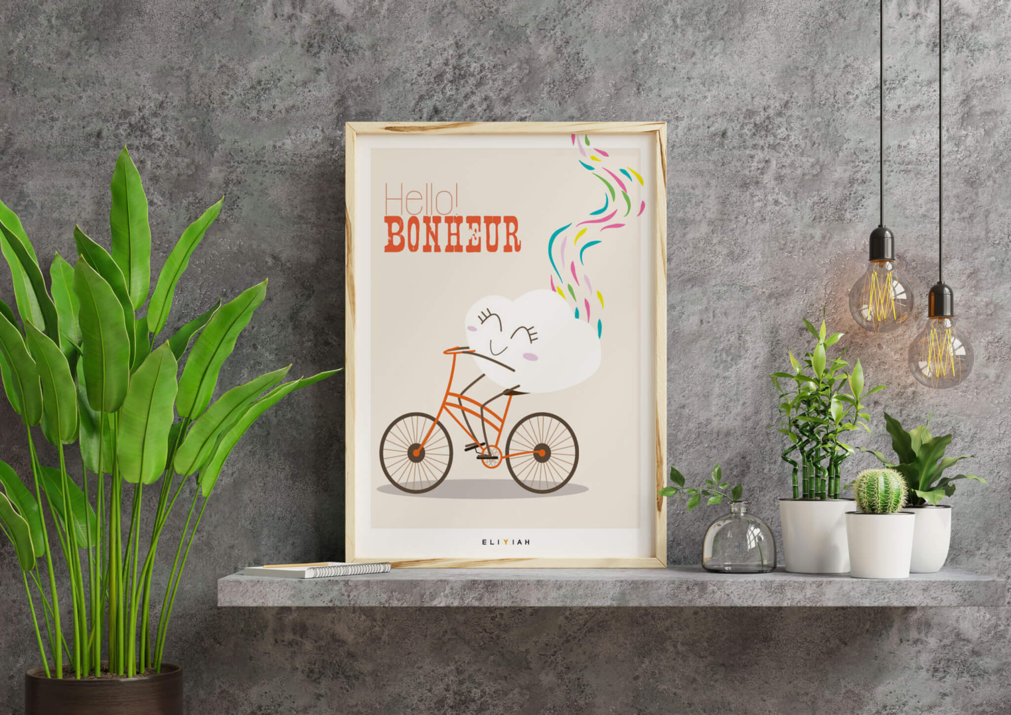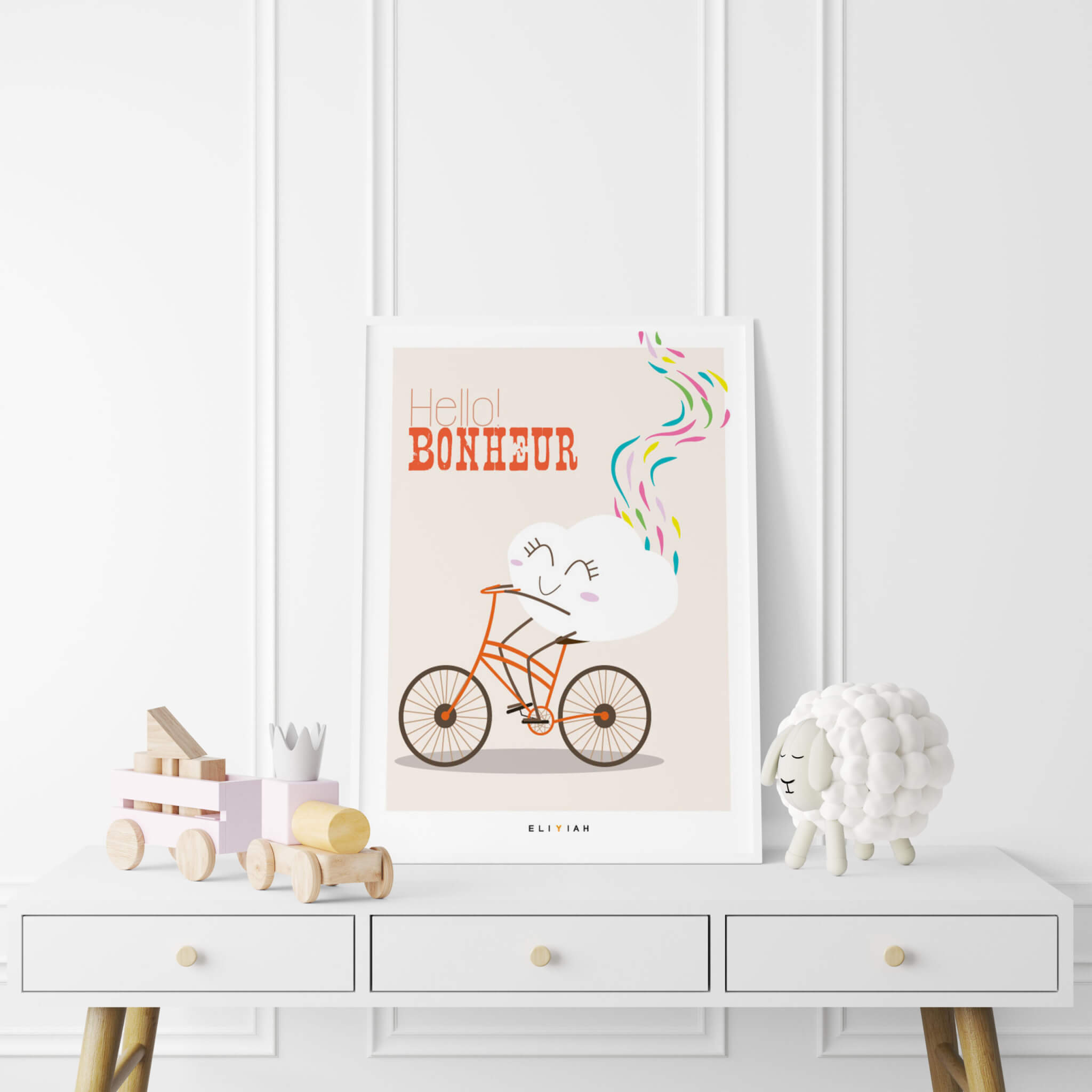 Ajoutez une touche de positivité à votre maison avec notre affiche illustrée représentant un nuage faisant du vélo, avec l’inscription « Hello Bonheur ! ». Cette charmante illustration apportera une ambiance chaleureuse à n’importe quelle pièce de votre maison ou de votre bureau. Commandez dès maintenant notre poster décoratif unique et apportez du bonheur à votre vie quotidienne.
