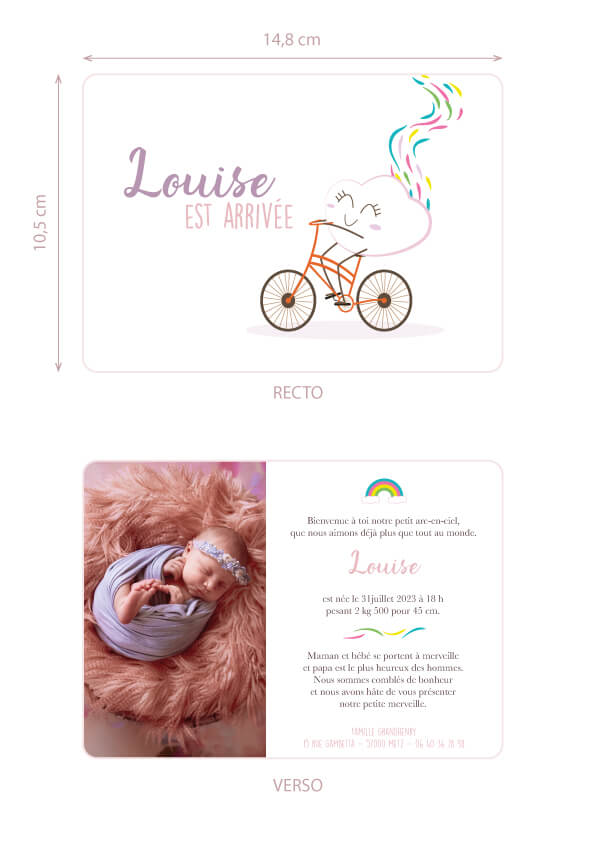 Faites savoir à vos proches l’arrivée de votre petite fille avec notre collection de faire-part de naissance. Notre modèle faire-part naissance fille nuage est parfait pour célébrer l’arrivée de votre petite princesse et pour capturer ce moment précieux, qui est une étape importante de votre vie.